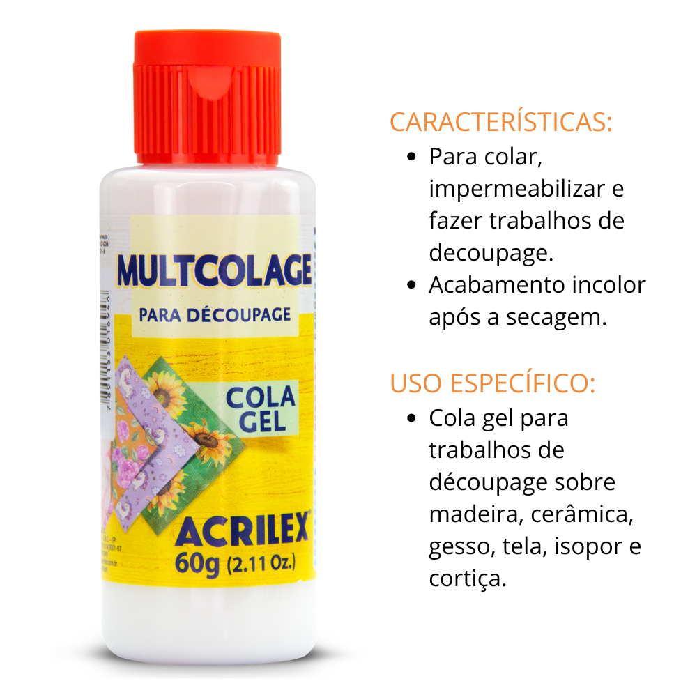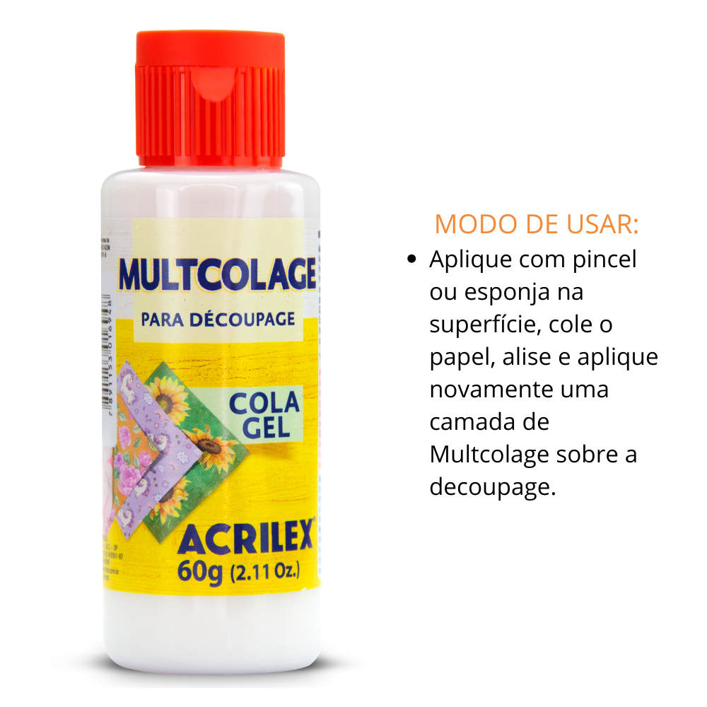 A Multcolage Cola Gel Acrilex é a escolha ideal para quem trabalha com técnicas de decoupage, colagens artísticas e trabalhos manuais em geral. Com consistência em gel e transparência após a secagem, ela não enruga o papel e proporciona alta aderência, sem deixar resíduos ou manchas.