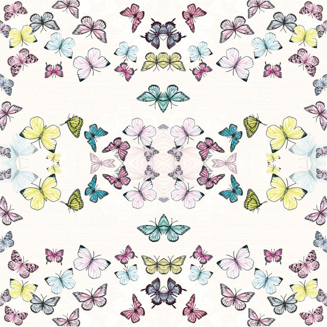 - Design exclusivo: estampa refinada de borboletas multicoloridas sobre fundo branco puro.