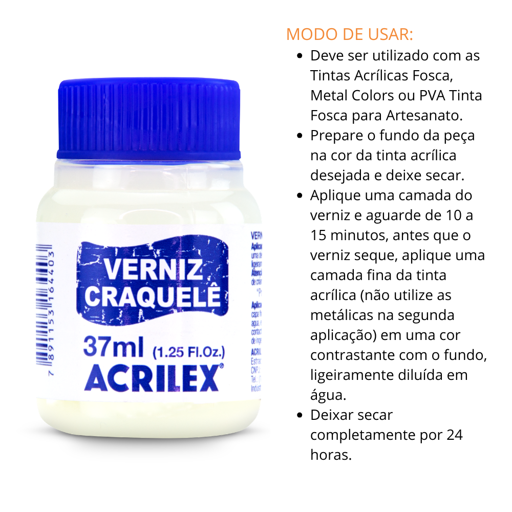 Indicado para craquelar as tintas acrílicas, pode ser aplicado em peças de gesso, madeira, cerâmica, metal, isopor etc.