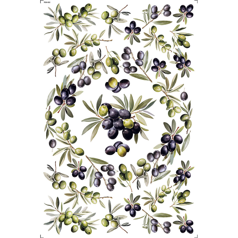 O Transfer de Imagem 19,5x29,5cm TEB-002 Espelhado Azeitonas é ideal para personalização e decoração de superfícies rígidas como cerâmica, papel, metal, vidro, madeira e MDF.